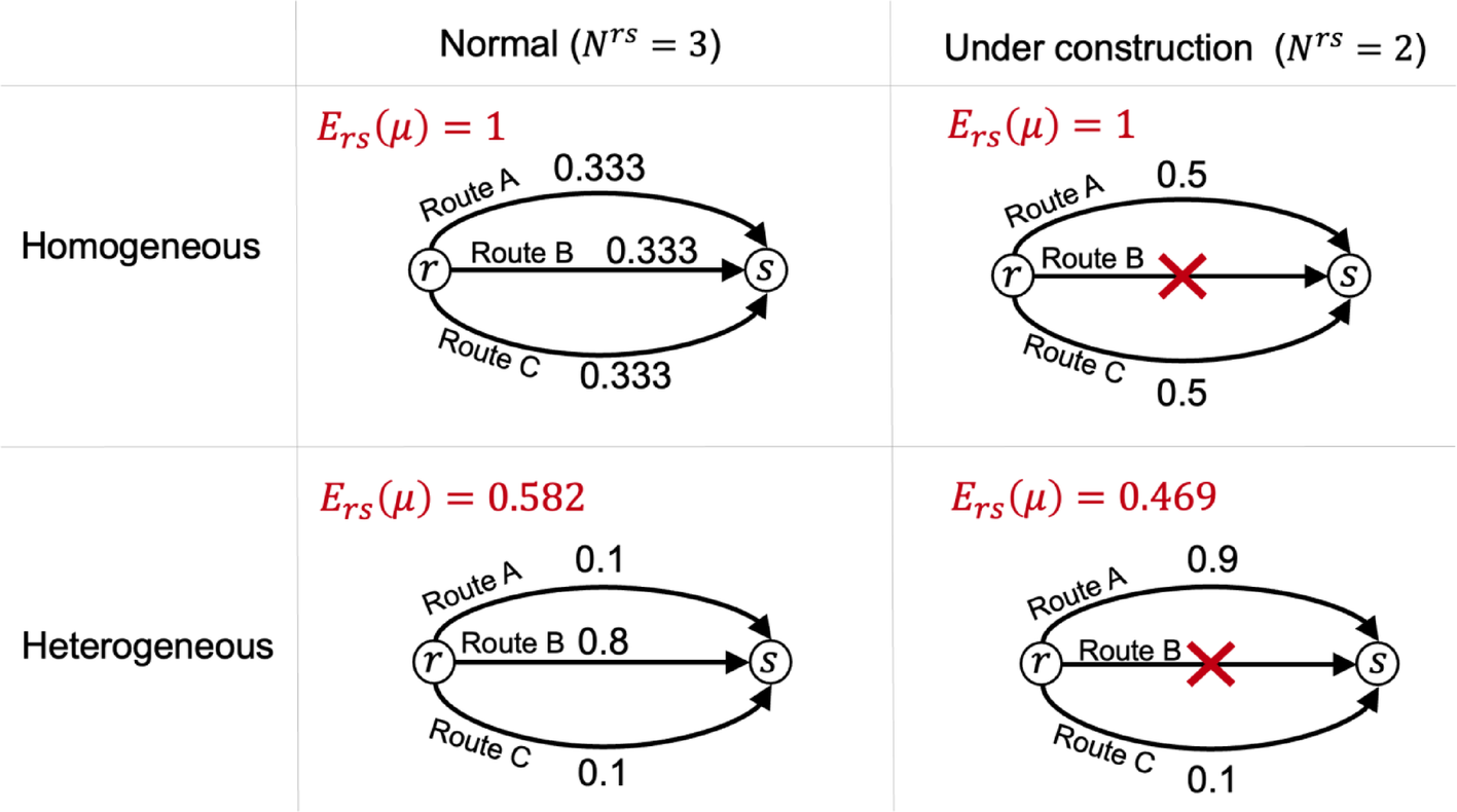 The simple example shown in Fig. 6 explains the variety of route choices using normalized entropy theory. The normalized entropy index defined by Eq. (4) for the heterogeneous and homogeneous route selection states is shown when the number of routes that can be selected (\({N}^{rs}\)) is different: three in normal situations and two under construction. In the case of perfectly homogeneous route choice, the \({E}_{rs}(\mu )\) remains unchanged at 1 in both normal and under construction situations. In the heterogeneous example in Fig. 6, if all users with \({N}^{rs}=3\) of the closed route (Route B) select the same alternative route, the demand would split between 0.9 and 0.1. The heterogeneity increases further when all users use the same alternative route (Route A). Entropy values decreased, indicating a more heterogeneous route choice. For \({N}^{rs}=2\) to have the same value of \({E}_{rs}(\mu )\)=0.582 as example of the heterogeneous state with \({N}^{rs}=3\), the demand is divided into 0.861 and 0.139 for each route. This means that the users of Route B are split to 0.761 (95.1%) and 0.039 (4.89%) out of 0.8 (100%). Here, we briefly examine how the evaluation changes when using the general (unnormalized) entropy index. The normal entropy corresponds to the case where the denominator in Eq. (4), \(\text{ln}{N}^{rs}\), equals 1. In this case, for the homogeneous examples with \({N}^{rs}=3\) and \({N}^{rs}=2\) in Fig. 6, the entropy values are 1.099 and 0.693, respectively. As these considerations show, entropy varies with the number of available routes. To enable consistent comparisons across differing route sets caused by road closures, the study therefore employs the normalized entropy index.