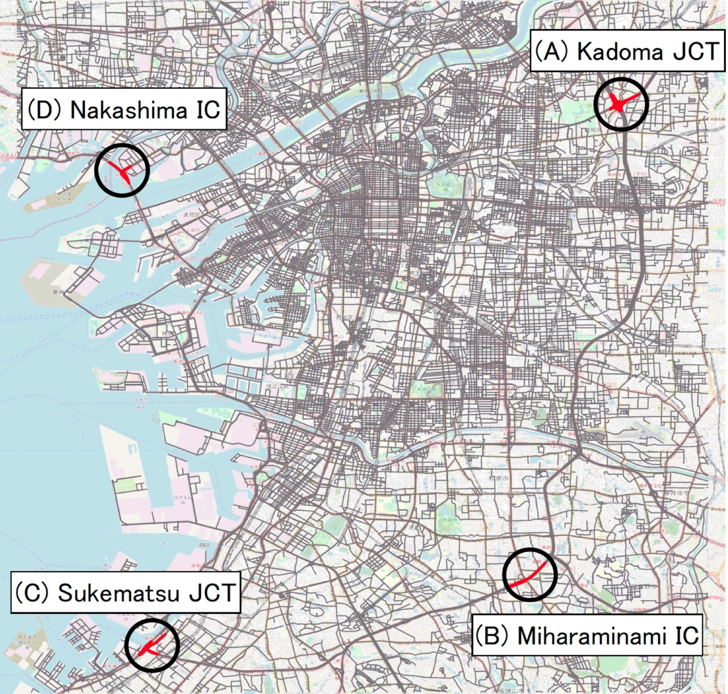 For analysis based on the OD in the traffic control targeted in this study, we set up representative zones that were virtual gate ODs. Four representative zones were established to cover all four sides of the target area, as shown in Fig. 7. A:Kadoma junction (JCT); B:Miharaminami interchange (IC); C:Sukematsu JCT; D:Nakashima IC. In addition to location conditions, zones are defined at traffic junctions where roads with large traffic volumes intersect (including ordinary roads located under the junction overpasses), and interchanges that serve as expressway access points. These sites were chosen because their lower speeds at major intersections enhance the likelihood of capturing passing vehicles. The trips with gate ODs in these four zones were extracted using the method described in Sect. “Trip identification between gate–OD pairs”.