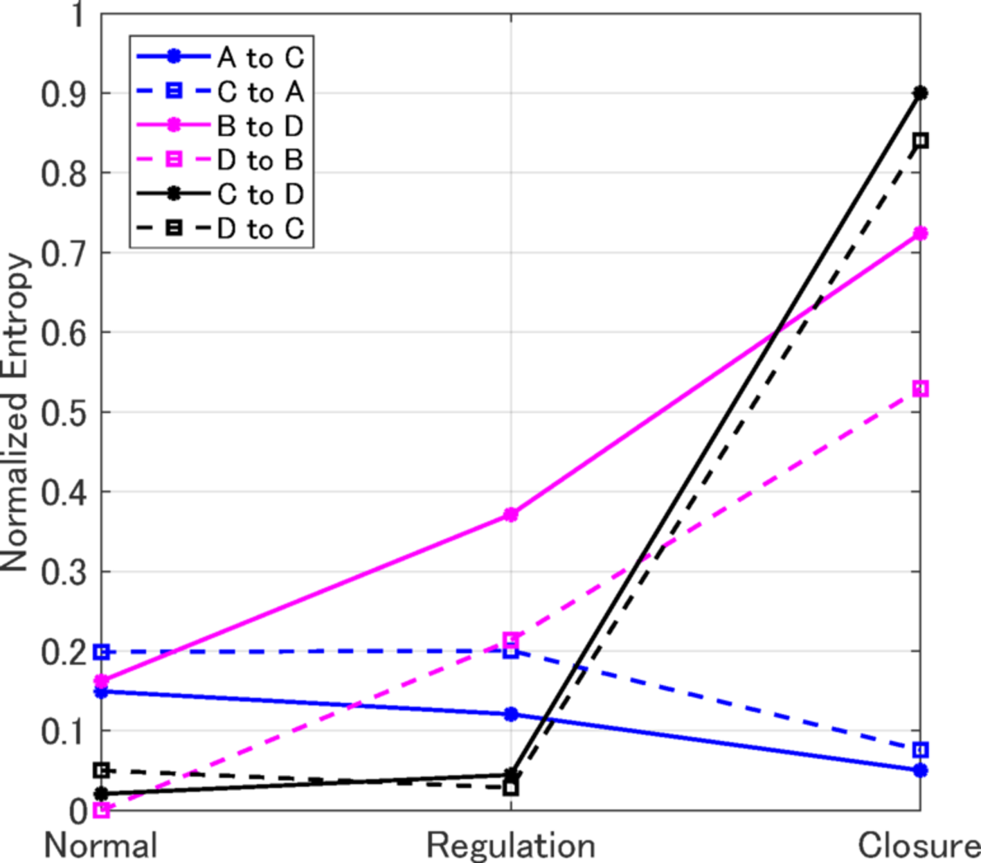 Another feature of Sites B and D is that they differ in the variety of route choices in each direction. B to D were more diverse than D to B in all the periods. This seems to be due to the spatial characteristics of the roads. Examples C and D are extreme examples. Table 4 presents the percentage of route choices from C to D during each period. A hyphen indicates an unusable route and distinguishes it from routes with 0% utilization. There was no change in the variety of route choices owing to lane restrictions in either direction, and the route choice was nearly uniform when the roads were closed. These results indicate that variations in route choices during lane restrictions are not directly related to route-choice behavior during road closures. The following section summarizes the implications of the analysis of the three bidirectional gate pairs. Gate pairs with a high percentage of sections to be closed during the normal period have various route options when the road is closed and the normalized entropy increases. In contrast, for gate pairs with a main route that does not include the section to be closed during the normal period, the route choices are concentrated when the road is closed, and the normalized entropy decreases.