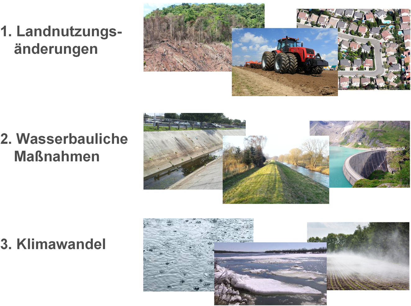 Drei Einflussfaktoren auf die Veränderungen von Hochwasser: Landnutzungsänderungen (Abholzung, Bodenverdichtung, Urbanisierung); Wasserbauliche Maßnahmen (Flussregulierungen, Hochwasserschutzdämme, Staudämme); Klimawandel (veränderter Niederschlag, Schneeschmelze und Verdunstung) (Blöschl 2022a)