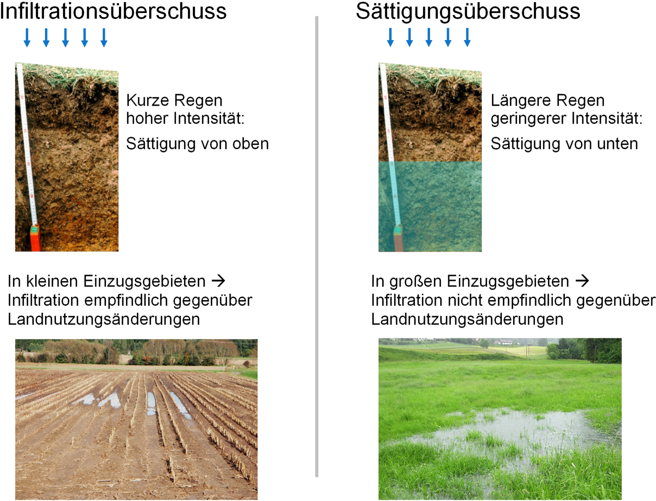 Effekt der Einzugsgebietsgröße auf den Einfluss der Landnutzung auf Hochwasser erklärt durch zwei Mechanismen der Abflussbildung. Links: Infiltrationsüberschuss, der Boden sättigt sich von oben nach unten. Oberflächenabfluss entsteht, wenn die Regenintensität die Infiltrationskapazität übersteigt. Dies ist typischerweise in kleinen Einzugsgebieten bei kurzen, intensiven Starkregen der Fall. Rechts: Sättigungsüberschuss, der Boden sättigt sich von unten nach oben. Oberflächenabfluss entsteht bei vollständig gesättigter Bodensäule. Dies ist typischerweise in großen Einzugsgebieten bei längeren, verhältnismäßig weniger intensiven Starkregen der Fall. Die unterschiedlichen Mechanismen erklären warum Hochwasser in kleinen Einzugsgebieten stärker durch Landnutzungsänderungen als in großen Gebieten beeinflusst werden (Blöschl 2022a)