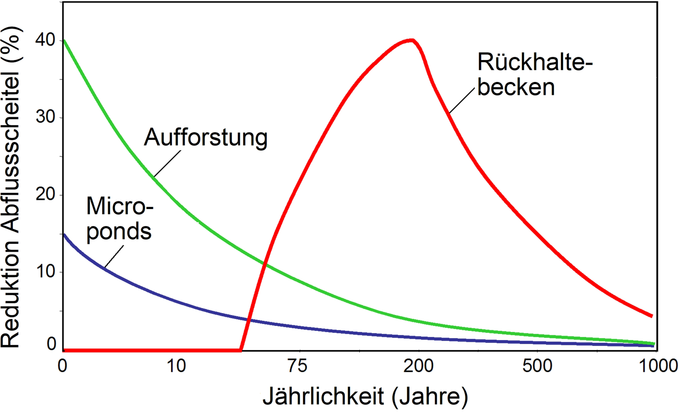 Effekt der Ereignisgröße auf den Einfluss von Rückhaltebecken, Microponds und Aufforstung auf Hochwasser (schematisch). Rückhaltebecken haben bei kleinen Hochwassern meist wenig Einfluss, da diese durchgelassen werden, bei extremen Hochwassern ebenso wenig Einfluss, da die Becken früh gefüllt sind. Der größte Effekt tritt bei mittleren Hochwassern auf. Microponds, d. h. kleine in der Landschaft verteilte Becken ohne Regelung sind bei kleinen Ereignissen am wirksamsten, ebenso die Aufforstung (Salazar et al. 2012)