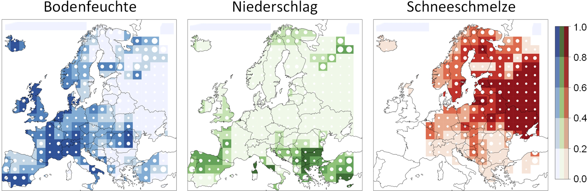 Beitrag zu den Veränderungen des 100-jährlichen Hochwassers basierend auf Abflussmessungen (1960–2010) durch Niederschlag, Bodenfeuchte und Schneeschmelze in Europa. Farbintensität zeigt den relativen Beitrag (z. B. bedeutet 0,5 einen Beitrag von 50 %). Weiße Kreise zeigen die Zuverlässigkeit der Berechnung, kleine Kreise sind zuverlässiger (Bertola et al. 2021)