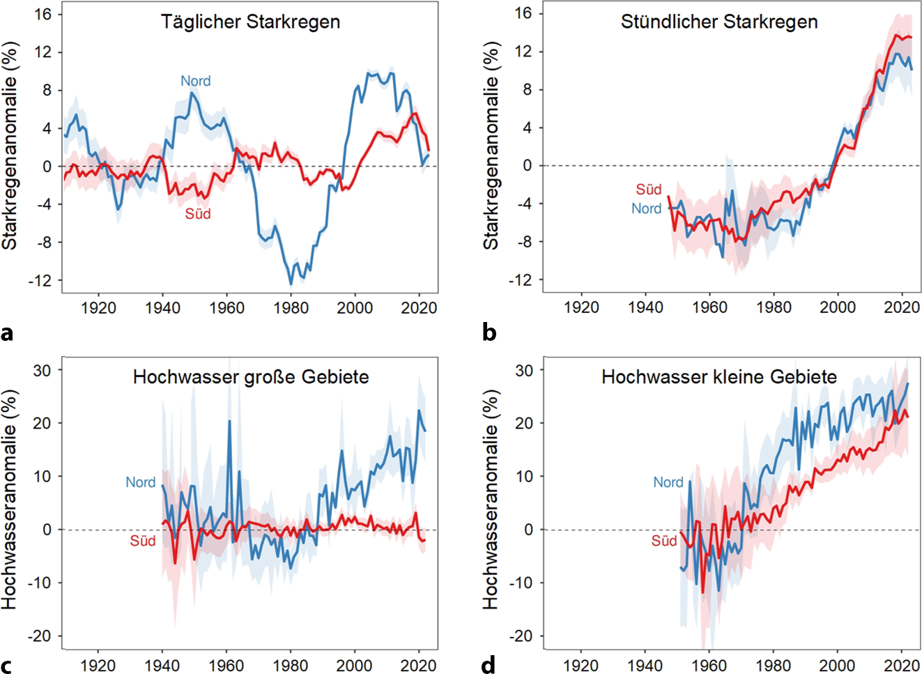 a,b Entwicklung der täglichen und stündlichen Extremniederschläge (99 Perzentile) in Österreich nördlich (blau) und südlich (rot) des Alpenhauptkammes. c,d Entwicklung der mittleren jährlichen Hochwasserabflüsse in großen (> 500 km2) und kleinen (< 50 km2) Einzugsgebieten. Alle Werte sind Messungen im Sommerhalbjahr (Haslinger et al. 2025)