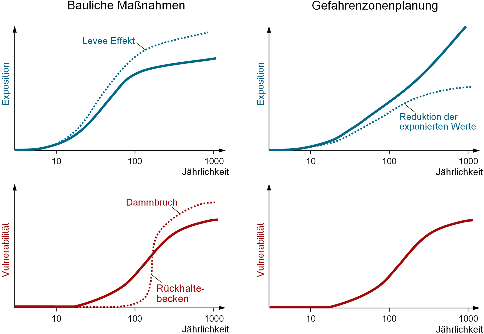 Beispiel für Exposition und Vulnerabilität in Abhängigkeit von der Jährlichkeit. Links: Situation bei baulichen Schutzmaßnahmen. Rechts: Situation bei raumplanerischen Maßnahmen der Gefahrenzonenplanung. Die Reduktion ader Exposition ist eine robuste Strategie zur Senkung des Risikos über ein breites Spektrum an Hochwasserabflüssen hinweg (Montanari et al. 2024)