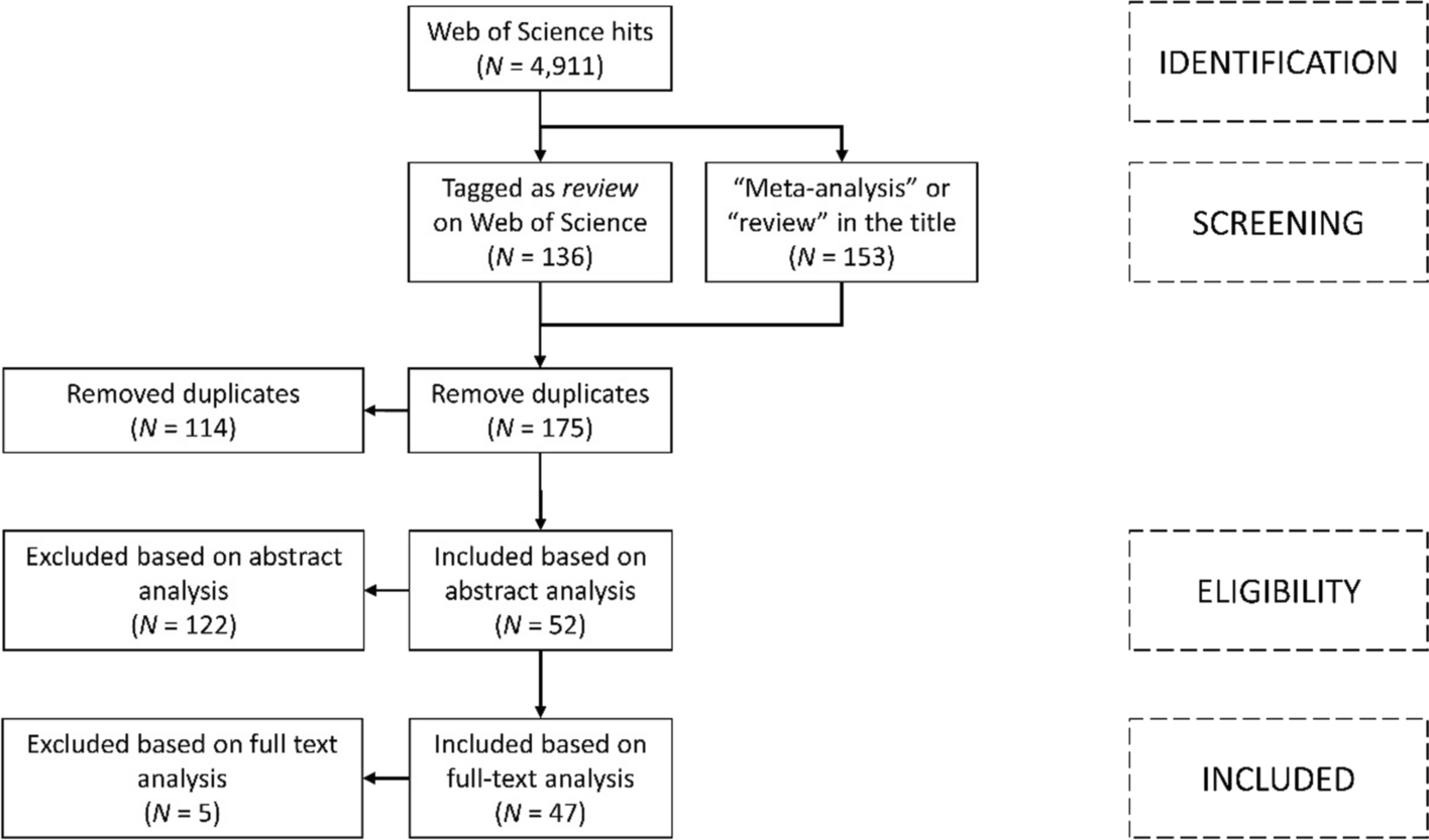 Figure 2 depicts the data reduction process, which was aligned with the PRISMA statement on how to conduct and report systematic reviews (Moher et al., 2009). The initial search resulted in 4911 hits. The search was then refined to reviews and meta-analyses only: a meta-review. This approach allowed for efficient identification and analysis of the most prominent research insights and current debates on the topic of effective online education. Moreover, this approach yielded a synthesis of both qualitative and quantitative findings, where the qualitative findings were, broadly speaking, represented by the included literature reviews and the quantitative findings by meta-analyses. All studies that were classified as a “Review” on Web of Science (n = 136) were included for abstract screening, as well as studies with either “review” or “meta-analysis” in the title (n = 153). After removing duplicates, 175 studies were eligible for abstract screening.