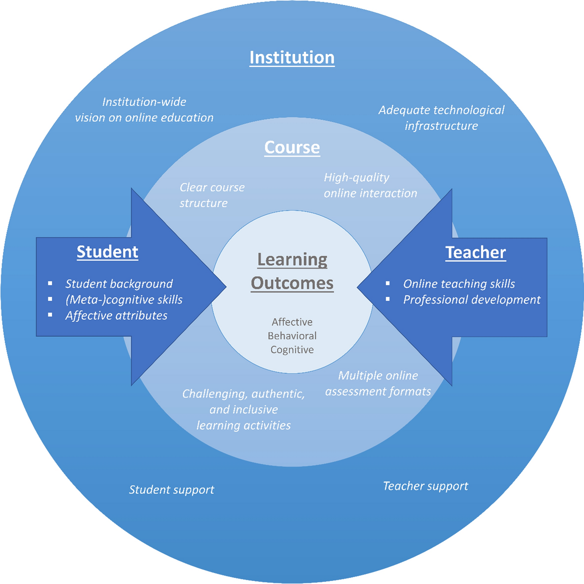 At the course level, a clear course structure is crucial for effective online education. In online education, students are expected to learn more autonomously than in on-site education, and there is less room for teachers to make “on-the-fly” adjustments. Course developers thus need to consider how to structure the online activities and assessments and to explicitly formulate how these contribute to students’ learning process. High-quality online interaction, whether synchronous or asynchronous, can be facilitated through meticulous course design and using netiquette guidelines to describe the kind of online interaction that is expected of students, as well as what students can expect of their teachers. At the student level, to learn effectively in an online setting requires students to have a positive attitude towards online education, high levels of self-regulation, and sufficient digital savviness to be able to use the provided tools effectively. At the teacher level, teachers need to possess teaching competences that are specific to online teaching (e.g., how to offer support remotely) and must believe in their own capabilities to teach online, both of which call for external support and professional development via formal training programs or informal learning communities. At the institutional level, institutions set the right conditions for effective online education by having a vision on online education that helps to converge all stakeholders toward a shared goal (viz., effective online education), providing adequate technological infrastructure, and actively involving and supporting teachers and students in adopting online forms of education that are new to most of them.
