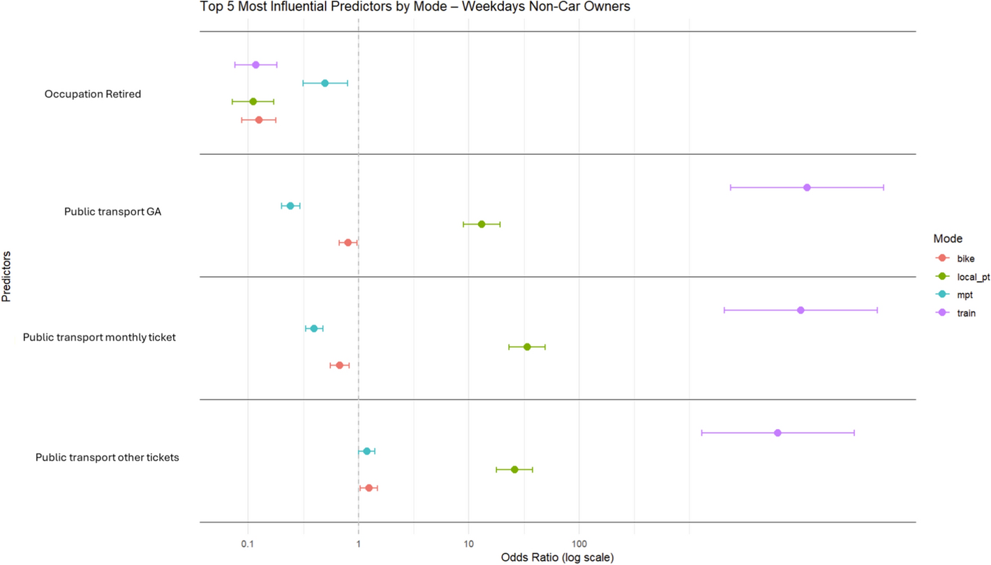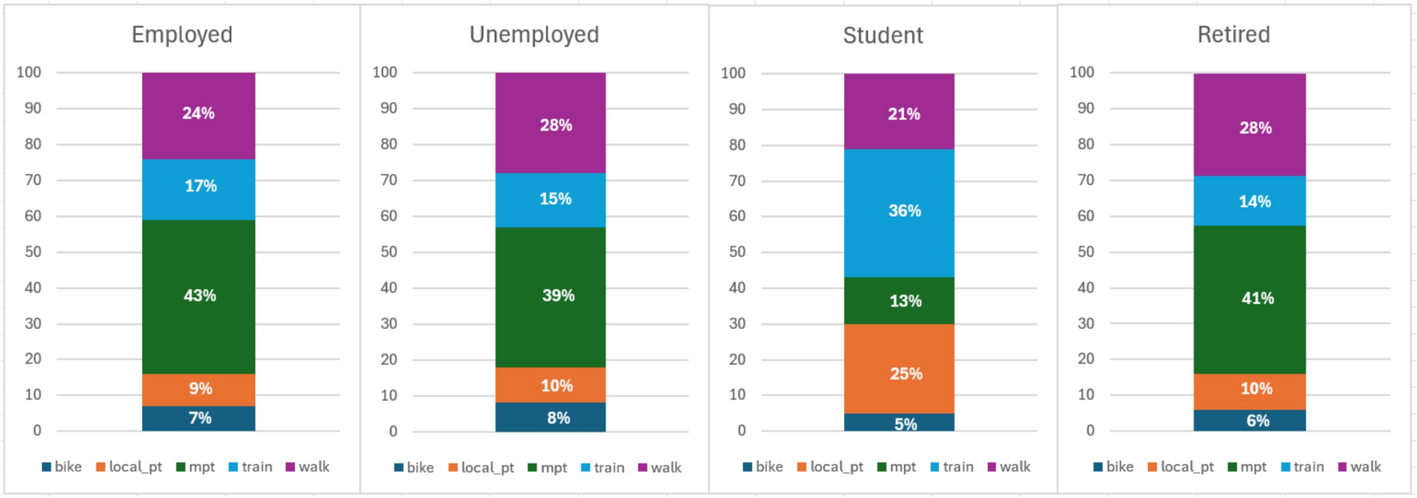Some of the attributes also had to undergo slight modifications to provide more precise information for our models. Attribute occupation had an unspecified value ‘other’ for about 12% of participants. The "other" category in occupation lacks a clear definition and introduces ambiguity into the model, weakening interpretability. To avoid unnecessary data loss (a further 12% of the dataset) while maintaining a representative sample, we chose to reclassify rather than exclude these participants. Since individuals in this group are explicitly not classified as employed or self-employed, unemployed is the closest approximation, as they likely do not have stable or formal work. It assumes they do not participate in formal labour markets, which is likely correct. In addition, to streamline the model, we also classified self-employed participants as employed, as the primary focus of the analysis is not on distinguishing between formal employment and self-employment. While self-employed individuals may have different travel behaviors compared to traditionally employed individuals, these differences were not deemed significant for the purposes of our study, which focuses on broader socio-economic factors influencing mode choice.
