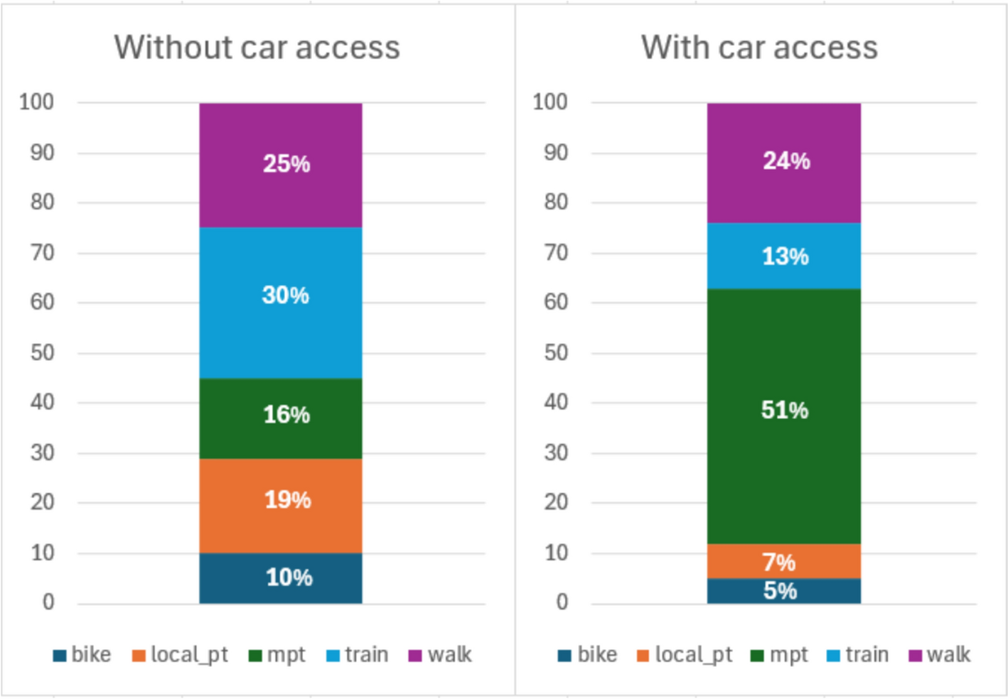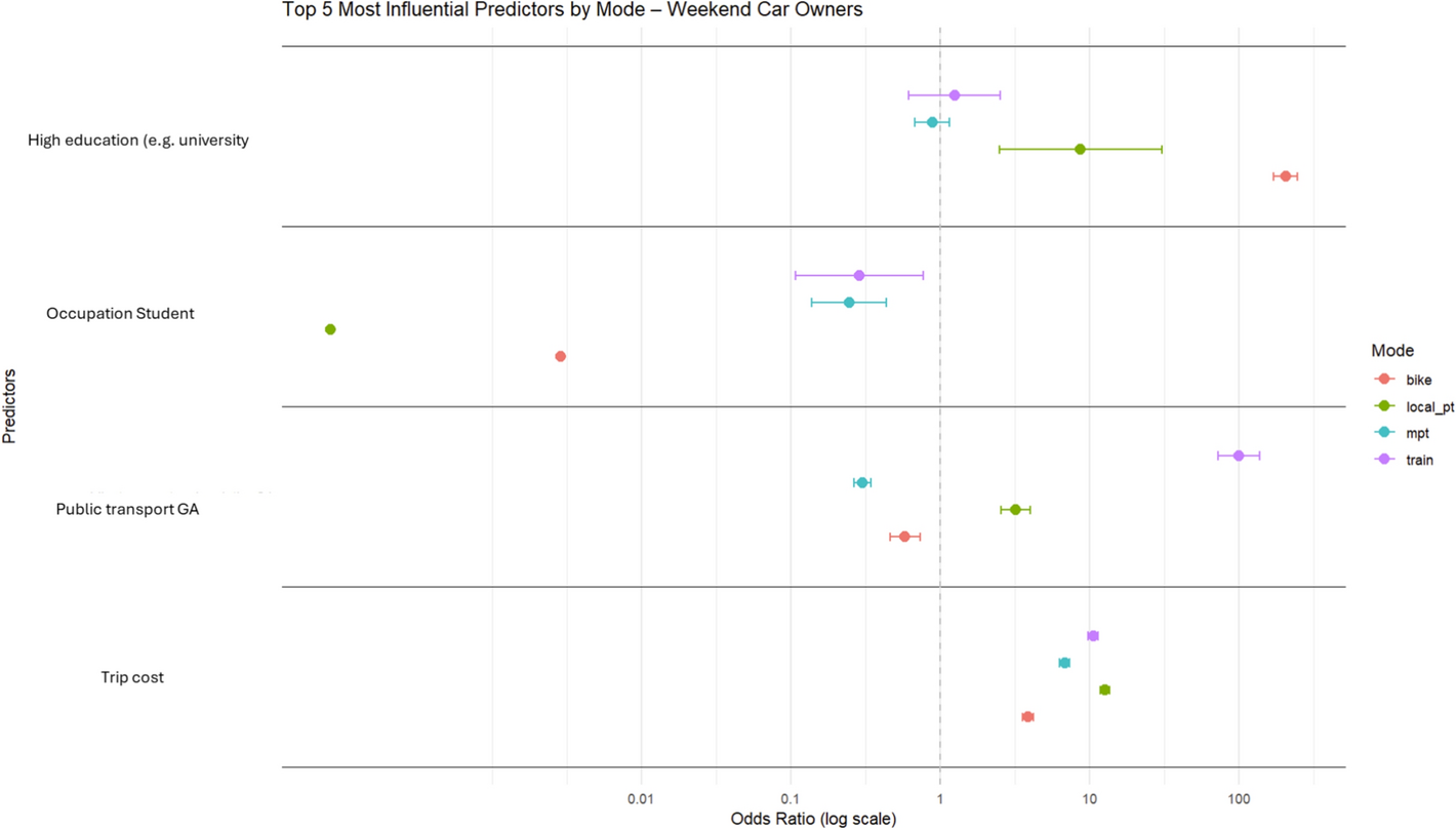 Inconsistency was found in some other attributes as well. Car and bike access had four values, ‘Yes’, ‘No’, ‘No, but I can arrange to borrow one from someone (e.g., my partner, friend, neighbour)’, ‘NA’. To overcome these inconsistencies and further streamline the model, we reclassified third and fourth values as ‘NO’ because irregular access does not equate to vehicle ownership (i.e., motorbike and/or car). The ability to borrow a vehicle does not guarantee consistent access, meaning these individuals are functionally closer to those without a car. We treated ‘NA’ as uncertainty and assumed ‘NO’ as the most conservative approach. Participants who do have access to a vehicle are more likely to report it, whereas missing responses could indicate a lack of access or low relevance to their daily mobility.