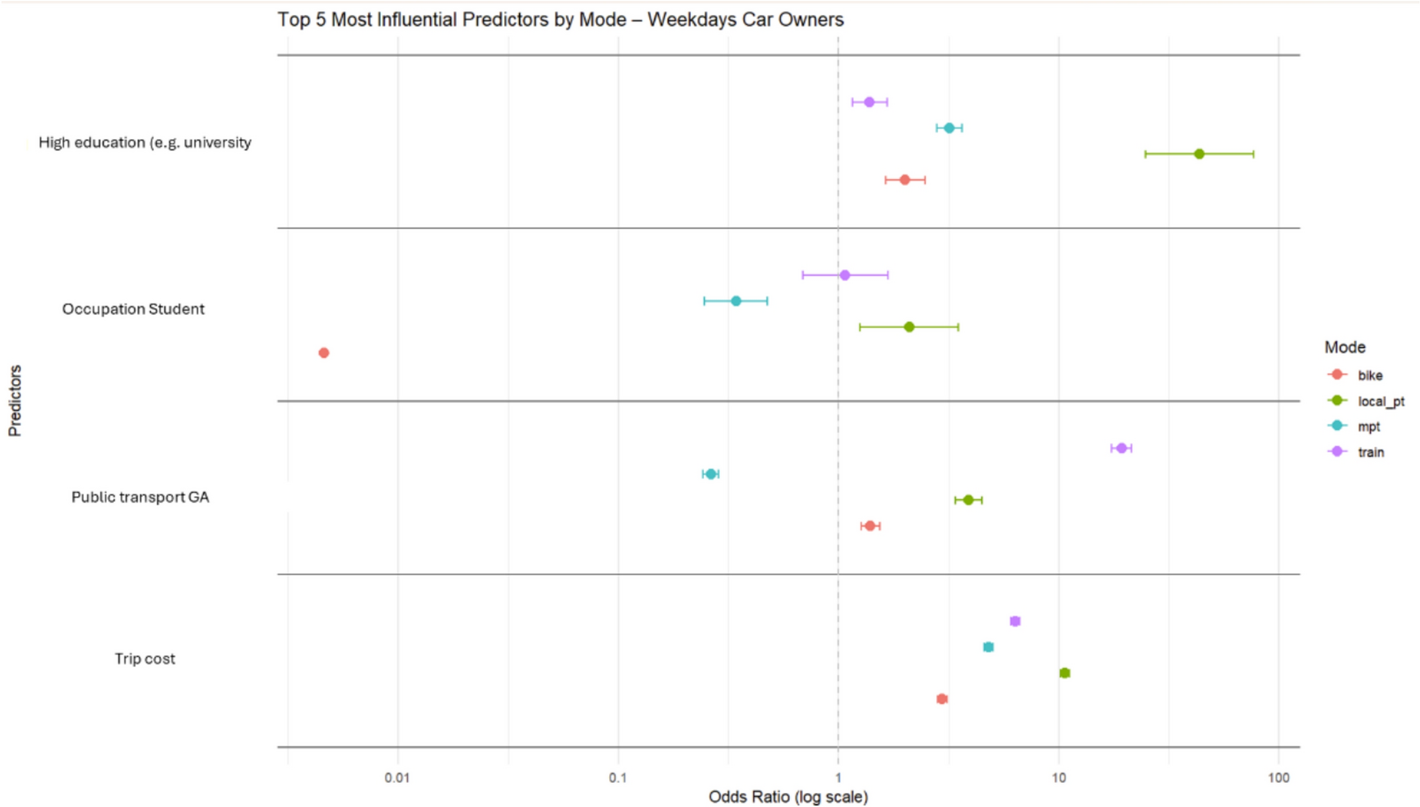 Most studies on mode choice continue to rely on regression-based approaches such as multinomial logit, mixed logit, or hierarchical models to estimate how socio-economic and contextual factors influence mobility decisions. These methods remain widely used due to their interpretability and relevance for transport policy analysis. While machine learning techniques like random forests and neural networks have gained attention for their ability to model complex and non-linear relationships, their lack of transparency and focus on prediction rather than explanation often limits their applicability for studies aiming to uncover underlying behavioral mechanisms.