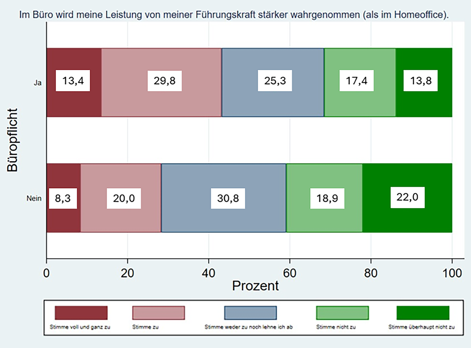 Ein Grund dafür könnte hier auch die empfundene Leistungswahrnehmung der Führungskräfte sein. In Unternehmen mit Quote, haben die Mitarbeitenden signifikant (Pearson χ2 = 37.3157, p < 0,001) häufiger das Gefühl, dass ihre Leistung im Büro stärker wahrgenommen wird, als im Homeoffice – 43,3 % der Befragten mit Büropflicht stimmen hier der Aussage zu, dass im Büro ihr Leistung stärker wahrgenommen wird, während nur 28,3 % der Befragten ohne Quote so empfinden (Abb. 3).