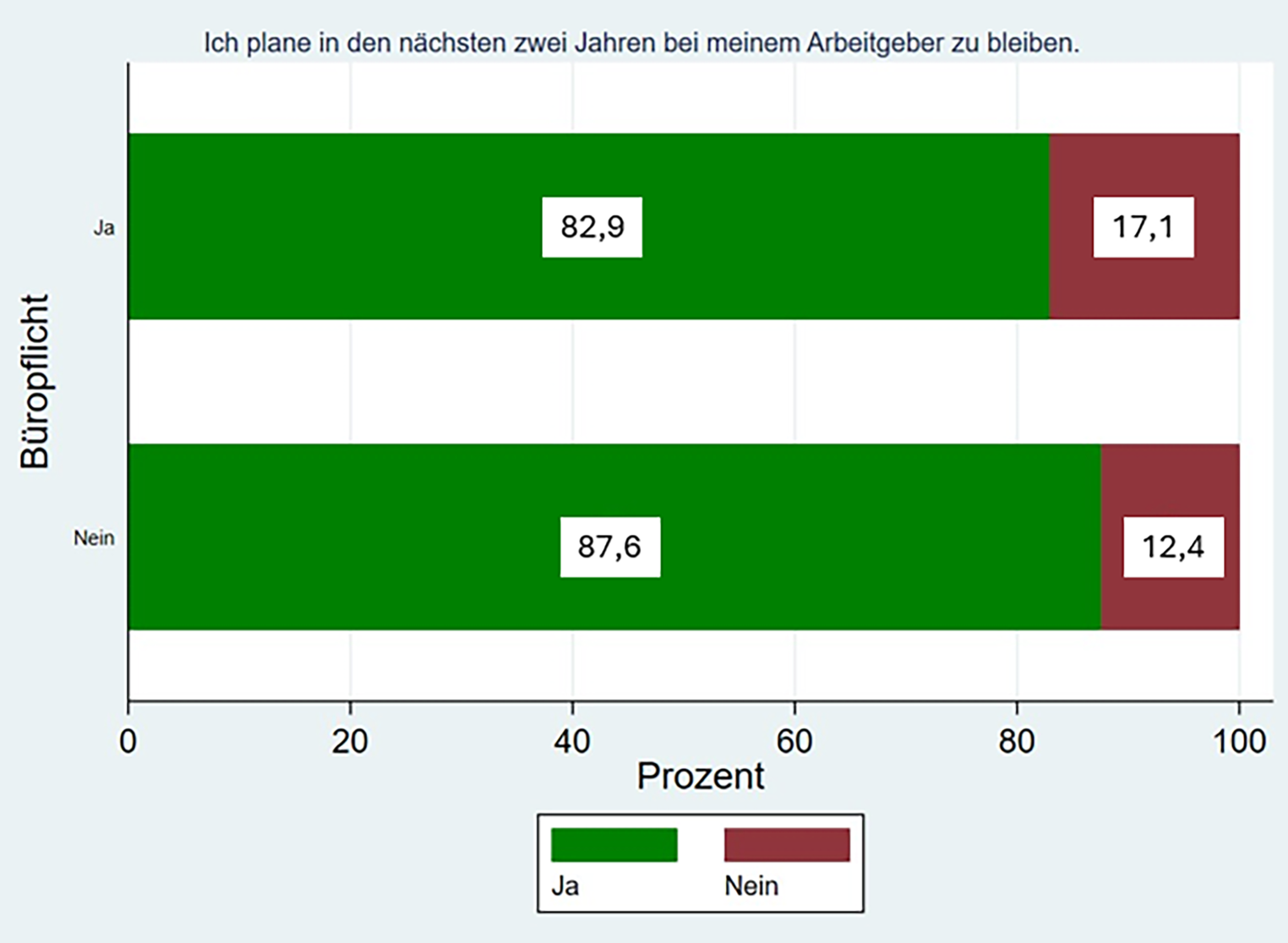 Mitarbeiter mit einer Büropflicht planen signifikant häufiger in den nächsten beiden Jahren den Arbeitgeber zu wechseln (Pearson χ2 = 5.6018, p = 0,018) (Abb. 4).